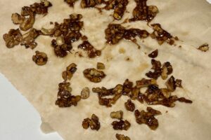 Transfer the mixture to a piece of parchment paper laid on your countertop. Spread out the walnuts so they don’t stick together and let them cool.