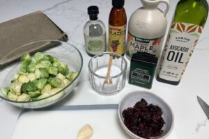 - Mix together the oil, vinegar, maple syrup, minced garlic, salt and pepper in a small bowl. Toss the Brussel sprouts in the sauce in a large mixing bowl.